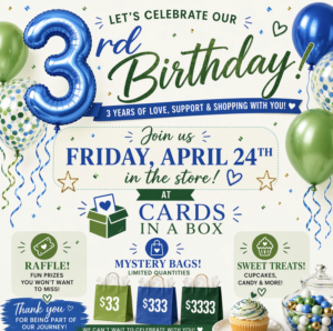Celebrate Cards In A Box’s 3rd Anniversary this Friday, April 24th!