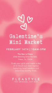Grab your besties and celebrate Valentine’s Day at Flea Style’s Galentine’s Mini Martket! Spend February 14th from 10AM–3PM at The Star in Frisco shopping Valentine’s-worthy treats, gifts, and curated local finds—made for the ultimate girls’ day out.