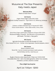 Join us at Musume Wednesday, April 1st, at 7:00PM, for an unforgettable Italy meets Japan dinner.